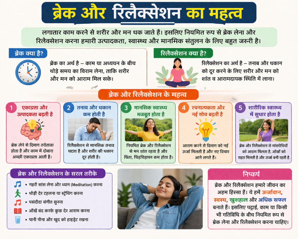 लेकिन ध्यान रखें कि ब्रेक के दौरान mobile या social media में ज्यादा time न बिताएं, क्योंकि यह आपका focus तोड़ सकता है।